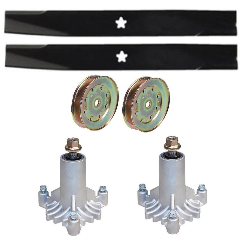 LT2000Additional Information: Kit Contains:(2) Spindle Assemblies3-Bolt Long,5 Point Star Center HoleReplaces Part Numbers: 130794, 532130794, 128285, 133172, 137641, 137645, 532 12 82-85, 532128285, 532 13 07-94, 53 213 31-72, 532133172, 532 13 76-45, 532137645, 183170, 532 10 14-77, 532 18 31-70, 532 1307-94(2) Drive PulliesOuter Diameter: 5-1/6″Inner Diameter: 9/16″Fits 42″ Deck modelsSteelReplaces Part Numbers: 532153535,532173436,532177865(2) Mower BladesCenter Hole 5 point starLength 21″Thickness .187Width 2-1/4″Replaces Part Number: 532134149, 532138971, 594892701, 777134149