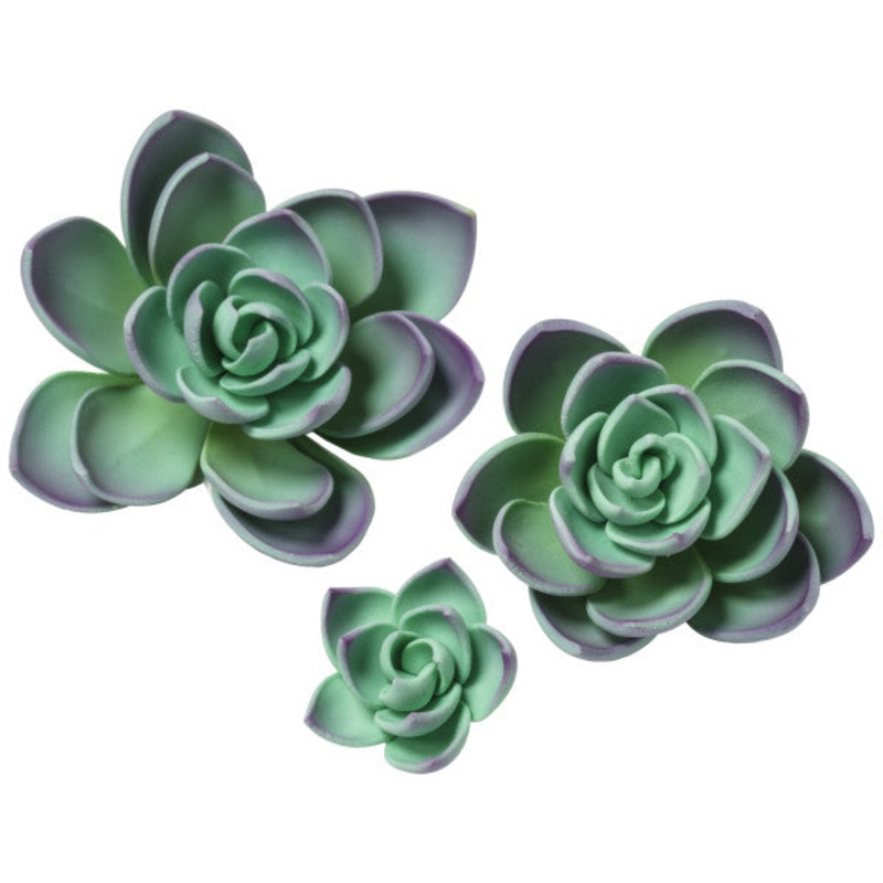 Handmade, pre-wired gum paste succulents provide the perfect natural element to cake designs. Succulent blooms have green petals with light purple tips. Gum paste is food safe and intended as non-edible decoration only.Dimensions:Small Purple Succulents: 1