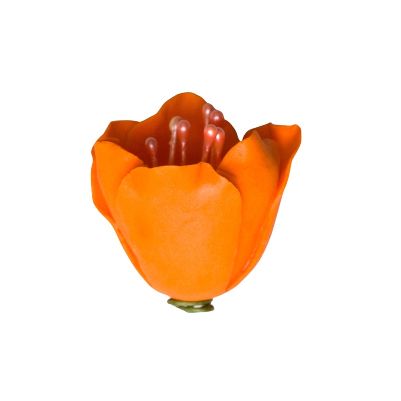 Item: Gumpaste TulipColor: OrangeDimensions (HxLxW): 1" x 1" x 1"(Measurements Exclude Wire)*contains wireThese handcrafted tulips are created from gumpaste and have matching colored stamens. The tulips have a rounded base and contain wire for placement. T