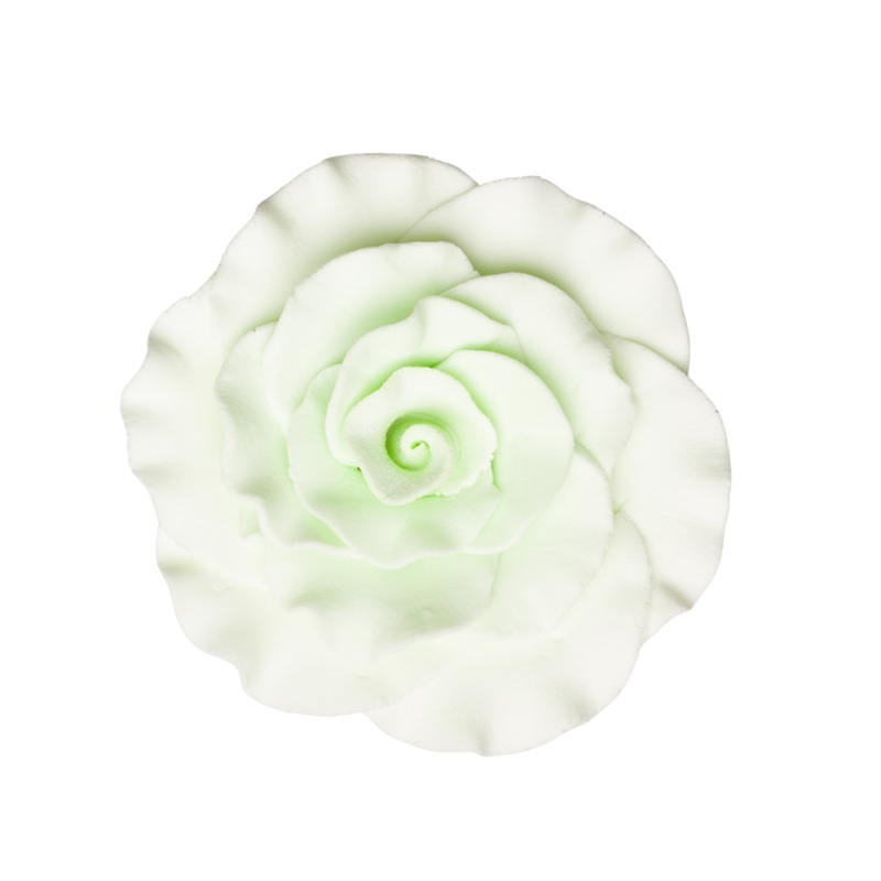 Item: Formal RoseSize: 3 InchesColor: Mint GreenThere is a hole in the base at the center - so you can turn over the rose and add a wire or a pick if you like - to accommodate your design (comes without wire).