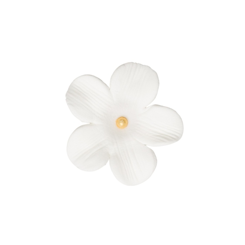 Item: Charming BlossomColor: WhiteSize: 1.5"These adorable blossoms are thin (flat) and do not have a base. They are dusted with pearl dust and accented with a gold dragee.NOTE:Dragees (pronounced Dra-jeys) are shiny little metallic balls that we all remem