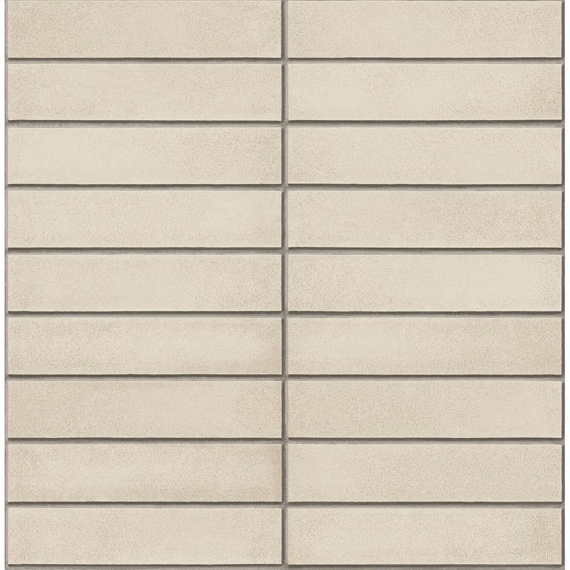 Sleek and understated, this pattern gives the look of a brick wall. The traditional brick shape is given a midcentury modern twist to be slimmer and longer. A mottled texture is created with on the beige blocks with raised ink in taupe.