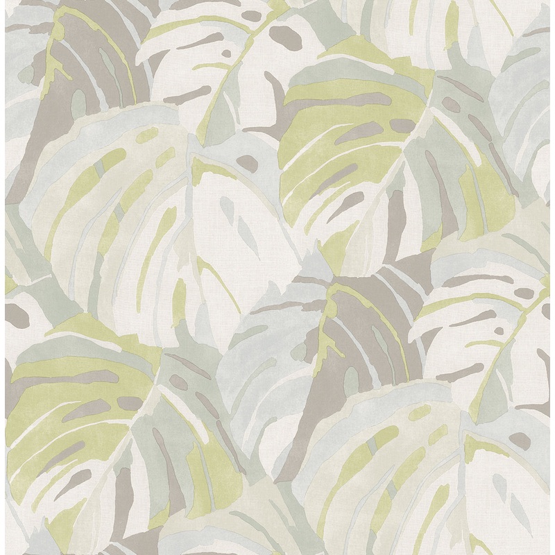 Add some tropical flair to your home with this bright, botanical wallpaper. Overlapping monstera leaves inked in bright green, blues, greys and white are a perfect way to bring those vacation vibes to your space. Samara is an unpasted, non woven wallpaper.