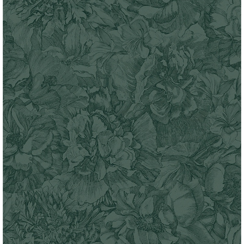 This moody botanical wallpaper is perfect for adding a vintage flair to your interiors. Its exquisite emerald design features flowers intricately inked in dark green that seem to unfurl as you look at them. Auguste is an unpasted, vinyl on non woven wallpaper.