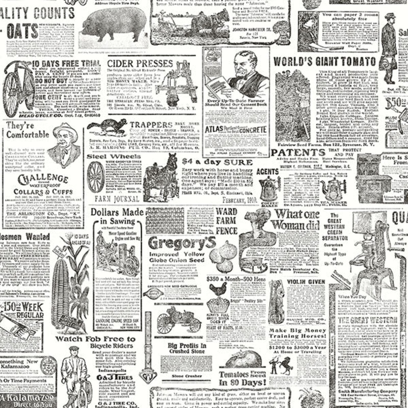 Compiled vintage ads for an array of goods and services are on display in this novelty design. Its faded black texts and crisp white backdrop give this wallpaper an antique vibe. Underwood is a prepasted, non woven blend wallpaper.