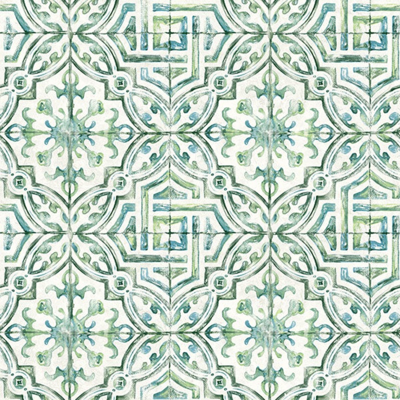 An organic green and white color palette makes this faux tile wallpaper timeless. Its worn details add to the authentic look of tiles in this Spanish inspired design. Sonoma is a prepasted, non woven blend wallpaper.