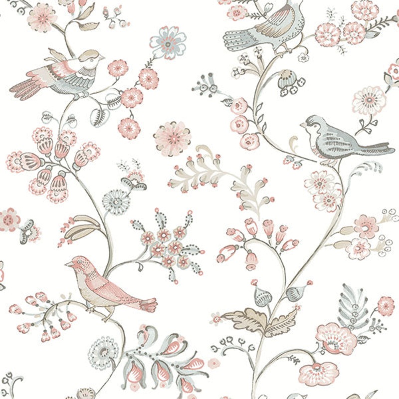 This sweet, illustrative wallpaper brings elevated country stylings to your walls. Twining vines are bursting with blush and blue blooms, with curious sparrows perched among the flowers. Jinjur is a prepasted, acrylic coated paper wallpaper.