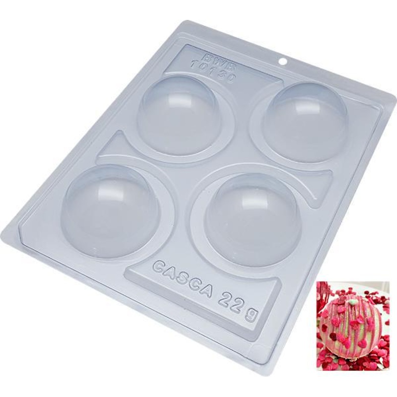 With this BWB 3-part Special Mold you can create professional pralines in the form of domes. Create beautiful pralines with minimal effort and little cleaning. Simply top the bottom of the PET shape with chocolate to the marked filling line, place the flex