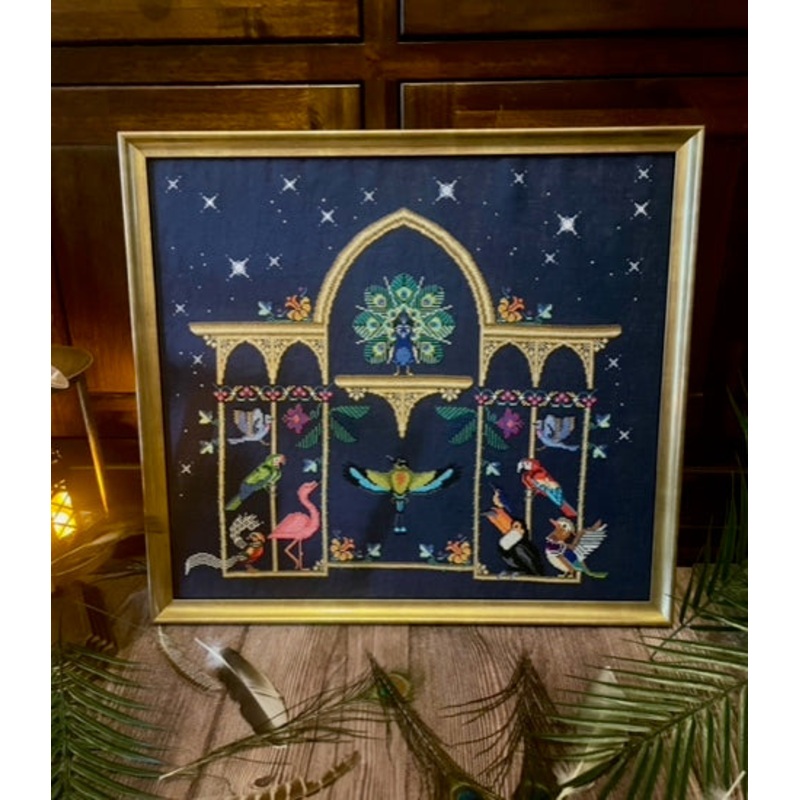Thebirds have gathered for a grandmeeting on a starry night, hosted by the Peacock and featuring a variety of exotic birds which are individually listed in the chart.Our largest chart yet! 275 stitches wide x 244 highFabric - 32ct Zweigart Navy Blueeven we