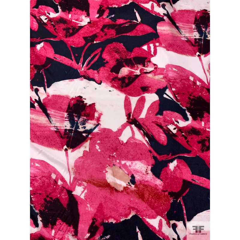Abstract Painterly Floral Printed Silk Habotai – Deep Pink / Navy / Off-White Fabric by the Yard