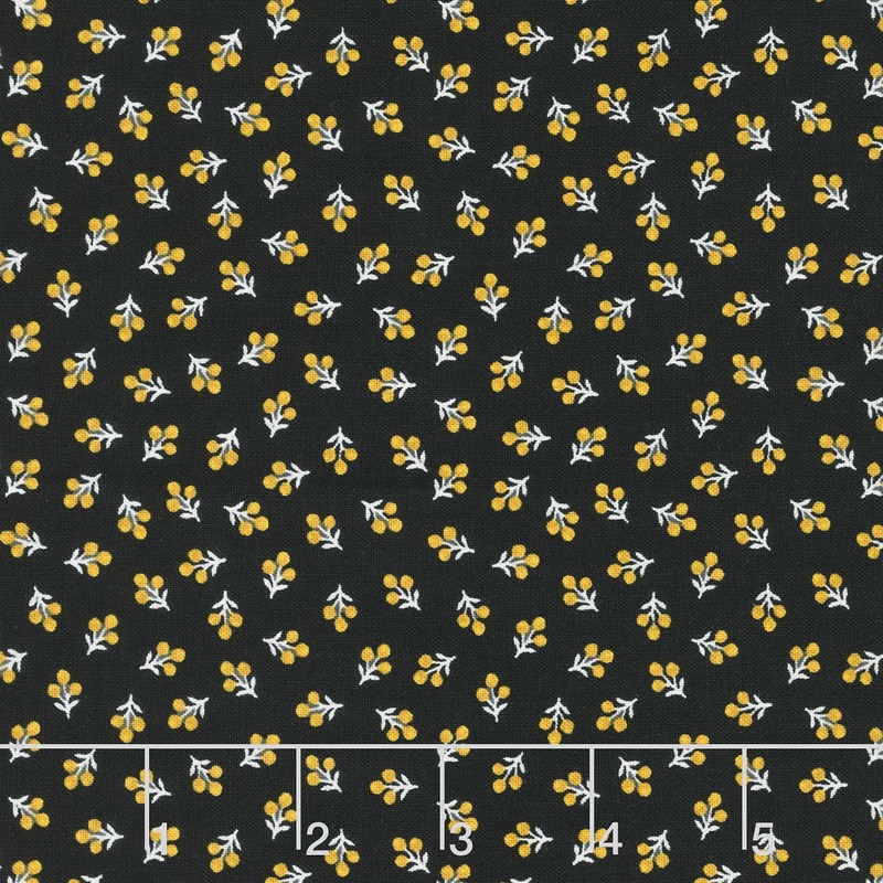 Petite gold berries with white stems scattered on a black background. Whether your project calls for traditional or modern design, the Alexandra collection has you covered. These prints by Williamsburg for Windham Fabrics include petite flowers, berries, a
