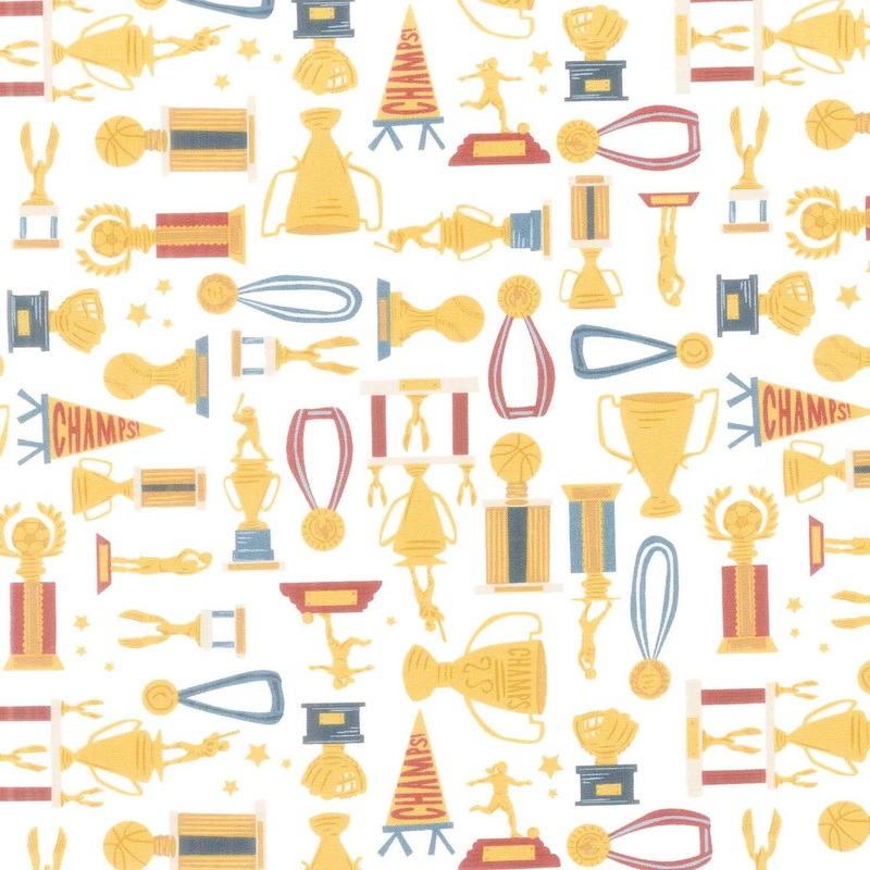 Gold, red, and blue trophies and awards on a white background. Score points with the athlete in your life by making a quilt for them from the All Star collection! These fabrics from Moda feature football, soccer, baseball, basketball, lacrosse, tennis and