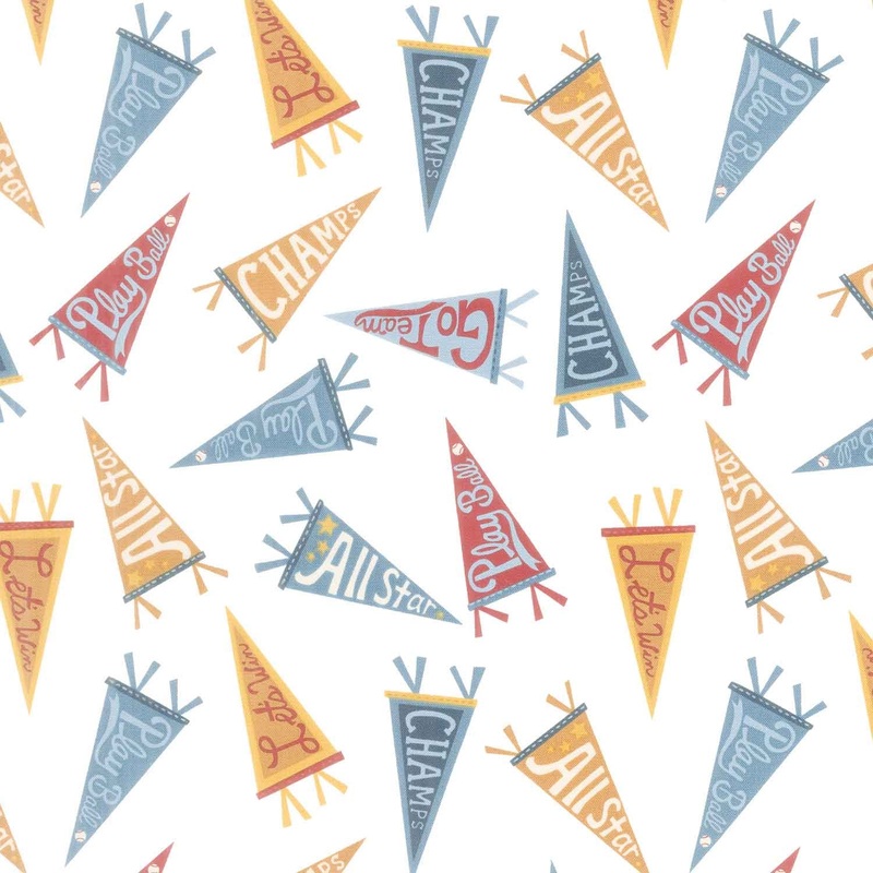 Gold, red, and blue pennants on a white background. Score points with the athlete in your life by making a quilt for them from the All Star collection! These fabrics from Moda feature football, soccer, baseball, basketball, lacrosse, tennis and more! Anything you make with these prints of sports gear, pennants, and trophies is sure to be a winner!