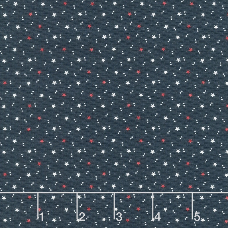 Red and white stars and white dots on a navy background. Make a lovely patriotic project with the American Gatherings II collection from Moda. Primitive Gatherings designed these dainty flowers, stars, stripes, and patriotic motifs in subdued shades of red, blue, dove, and white. Great for quilts, pillows and other home dcor.