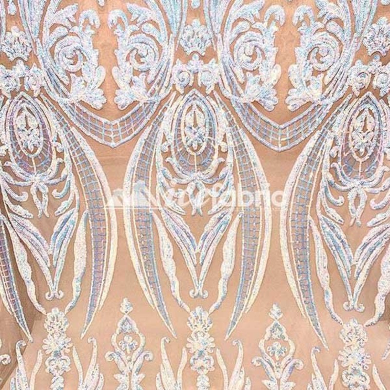 Baby Blue on Nude Geometric Sequin Fabric can be used for weddings, night parties, and proms apparel. It can also be used as tablecloths, skirts, or maxi dresses. It gives you a confident appearance and makes you stand out at any event. This beautiful, sequin-fabric dress will make you stand out from the rest at any event.