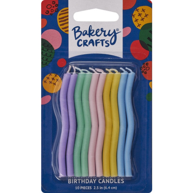 Celebrate with these wavy, thin candles. Assortment includes purple, green, pink, yellow, and blue smooth candles coming in pastel tones.