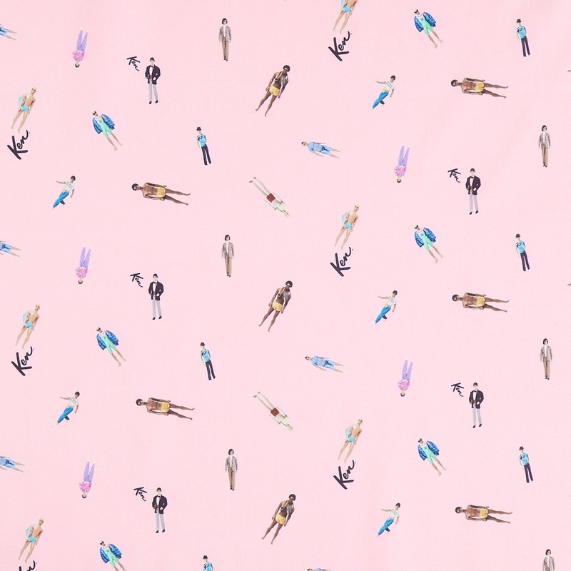 Ken dolls in different outfits tossed on a light pink background. I'm a Barbie girl in a Barbie world! Show off your love for America's sweetheart with this Barbie fabric collection pairing modern colors with vintage vibes. Featuring this iconic doll in he