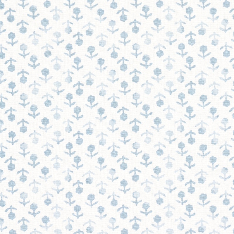 Inspired by traditional indigo resist-dye techniques, this hand-screened, pigment-printed floral is delicately diminutive and simply adorable. Beatriz Handprint fabric in sky color by Schumacher is a popular fabric in the Jacaranda collection. Schumacher P