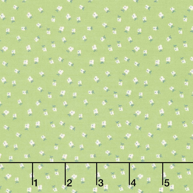 White flowers tossed on a green background. These fabrics will dot your eyes and suit you to a T! Bee Dots by Lori Holt for Riley Blake Designs is a charming collection of dots dots in grids, dots forming flower petals, and dots inside dots! These small dotted prints work well with solids or paired with larger, bold patterns in coordinating colors.