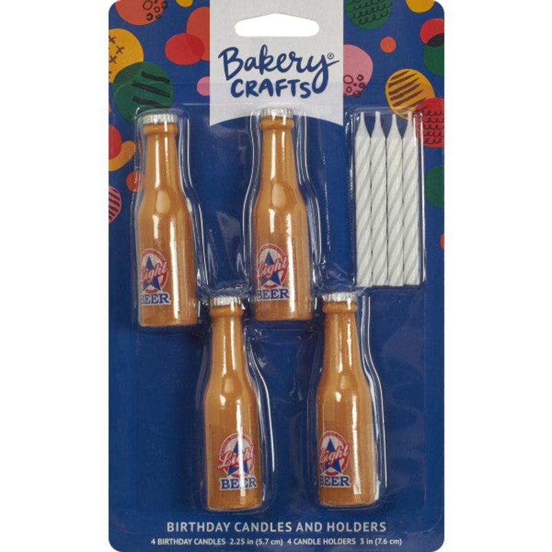 It's time to party with this fun, beer bottle candle holders! Each package includes 4 beer bottle candle holders and 4 white spiral candles.Dimensions:CANDLE HOLDER (4): 0.75 x 0.7 x 2.9 inchesCANDLE (4): 0.2 x 0.25 x 2.2 inches
