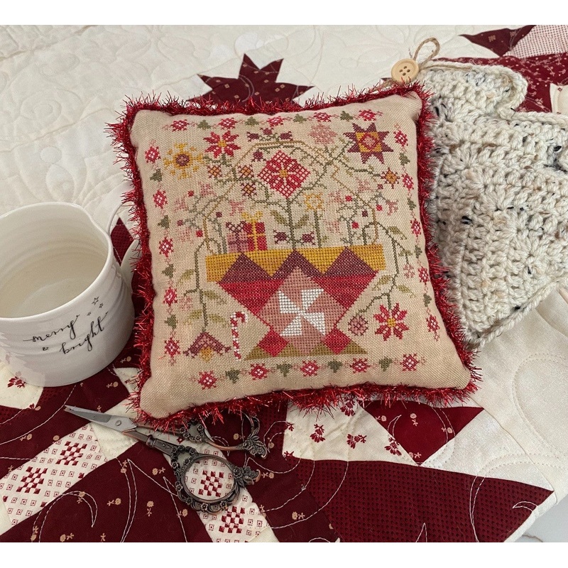 Betsy’s Christmas Basket is stitched on 36 count Tephra by Cedar River Linen, one strand of floss over two linen threads. Stitch count is 103w x 104h.