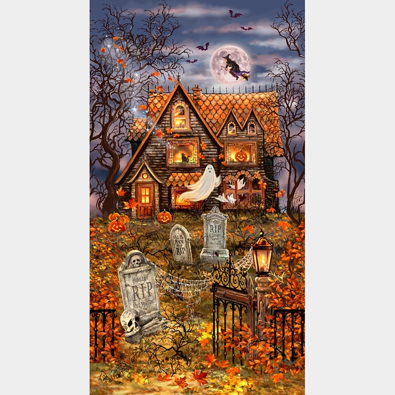 A panel featuring a haunted house with tombstones and ghosts. Scary good style! Bewitched by Dona Gelsinger for Timeless Treasures is a charming fabric collection full of Halloween motifs. This collection features moons, ghosts, tombstones, and more.