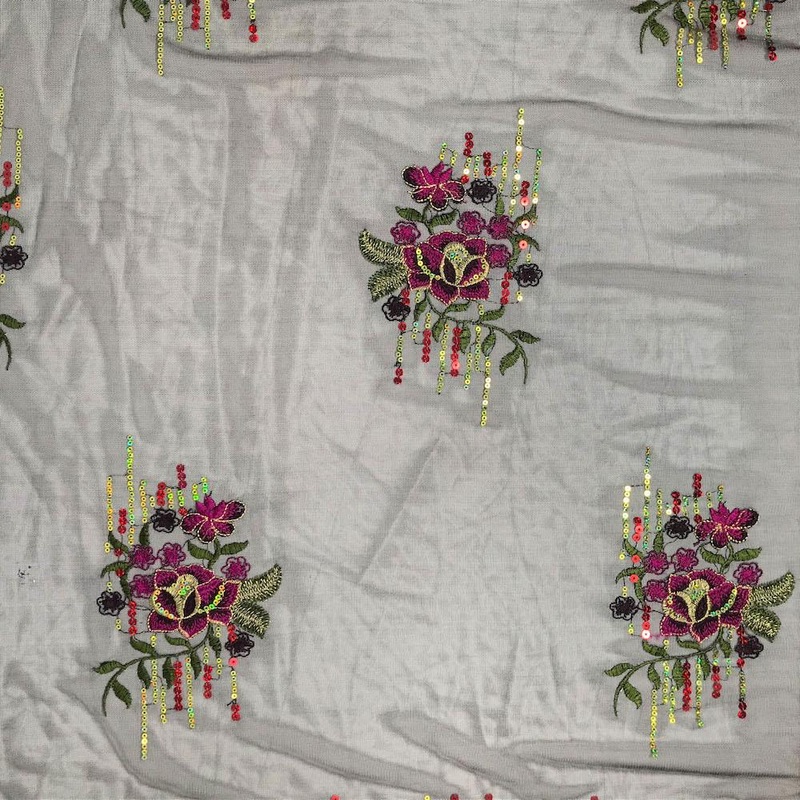 Our tulip patch sequins embroidery on mesh is 52" inches wide, 100% polyester, and hand sewn. The fabric features an embroidered tulip design along with small shiny sequins for an additional sparkle. This wonderful fabric has an elegant scalloped edge and