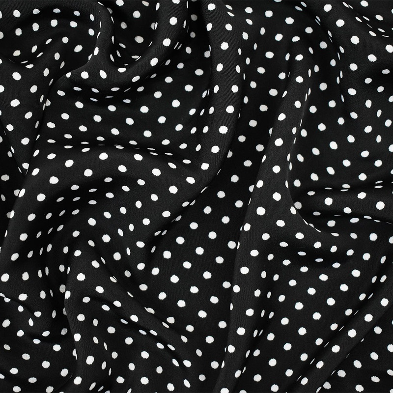 -100% polyester faille woven fabric printed with polka dots-Fiber Content: 100% Polyester-Width: 44"-Weight: Light-Transparency: Opaque-Hand: Soft-Stretch: No Stretch-Drape: Good Drape-Luster: Matte-End Uses: Apparel,Blouses,Dresses,Shirts,Apparel,Blouses,