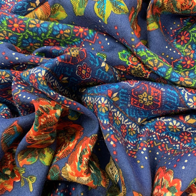 -Red, White, Green, Black, & Blue Floral Dot Print Rayon Challis Fabric-Fiber Content: 100% Rayon-Width: 58"-Weight: Tropical-Transparency: Opaque-Hand: Soft,Smooth-Stretch: No Stretch-Drape: Good Drape-Luster: Matte-End Uses: Apparel,Blouses,Dresses-Compa