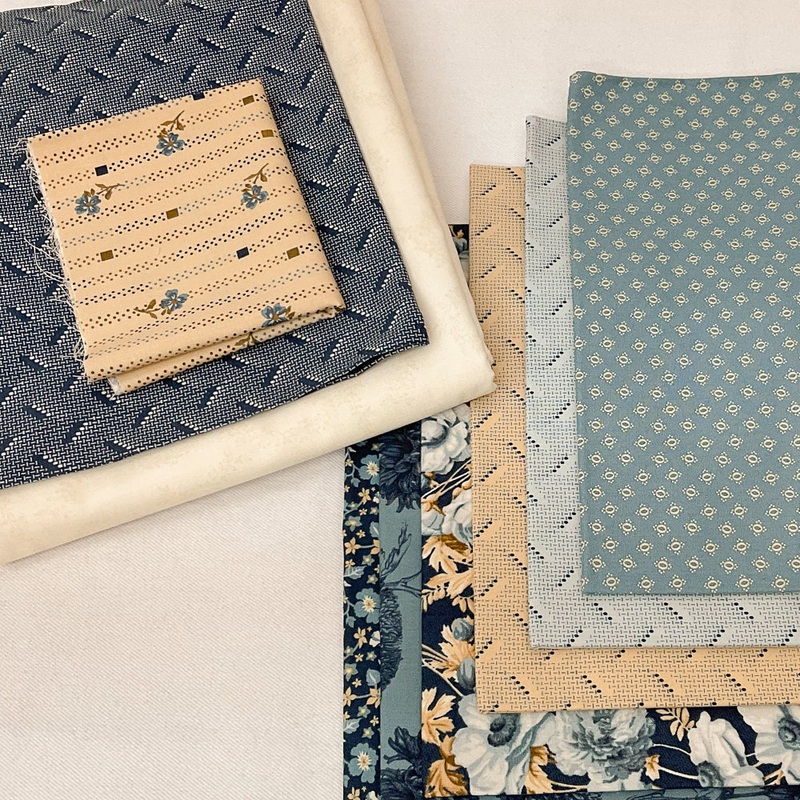 – Bundle fabrics include: 3/4 yd navy ivory dots dashes, 5/8 yd dusty blue yellow circle dot, 1/2 yd gray blue dots dashes, 1/2 yd beige blue dots dashes, 1/2 yd deep blue beige floral, 1/4 yd beige blue floral dot stripe, 1/2 yd deep blue floral, 3/4 yd deep blue yellow ditsy floral, 3 yds beige vine. Pattern is not included