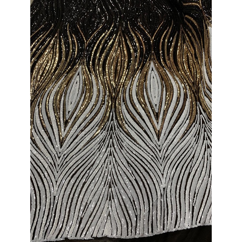 DescriptionGet a polished look with this Bridal Black, Gold, and White Embroider 4 Way Stretch Sequins Fabric By The Yard that is stunning and embroidered with sequins to add sparkle to your look.Elegant Wavy 4 Way Stretch Geometric Sequin Embroidery LaceB