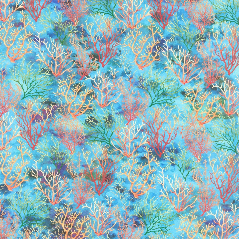 Colorful coral on a teal background. Get ready to dive into more fantastic ocean-themed prints in Calypso III. This collection by Jason Yenter for In the Beginning Fabrics features colorful coral, shells, tropical fish and other sea creatures, and lots of water! A quilt from these fabrics is sure to make a splash!