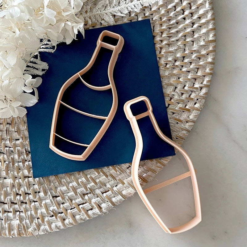 Comes with two cutters: One full cutter for the cookie and one segmented cutter to cut different colour fondant pieces or pressed lightly to use as an embosser.Champagne Bottle cutter 120mm tall by 49mm wide.Cut apart before use.Image for display purposes