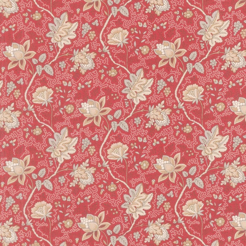 Tan and taupe flowers and vines on a red background. Say Oui! to Chateau de Chantilly! This collection, by French General for Moda, takes its inspiration from fabrics found in an old chateau in the South of France. The florals and small prints in red and neutrals combine to create a classic French design that would make a lovely quilt.