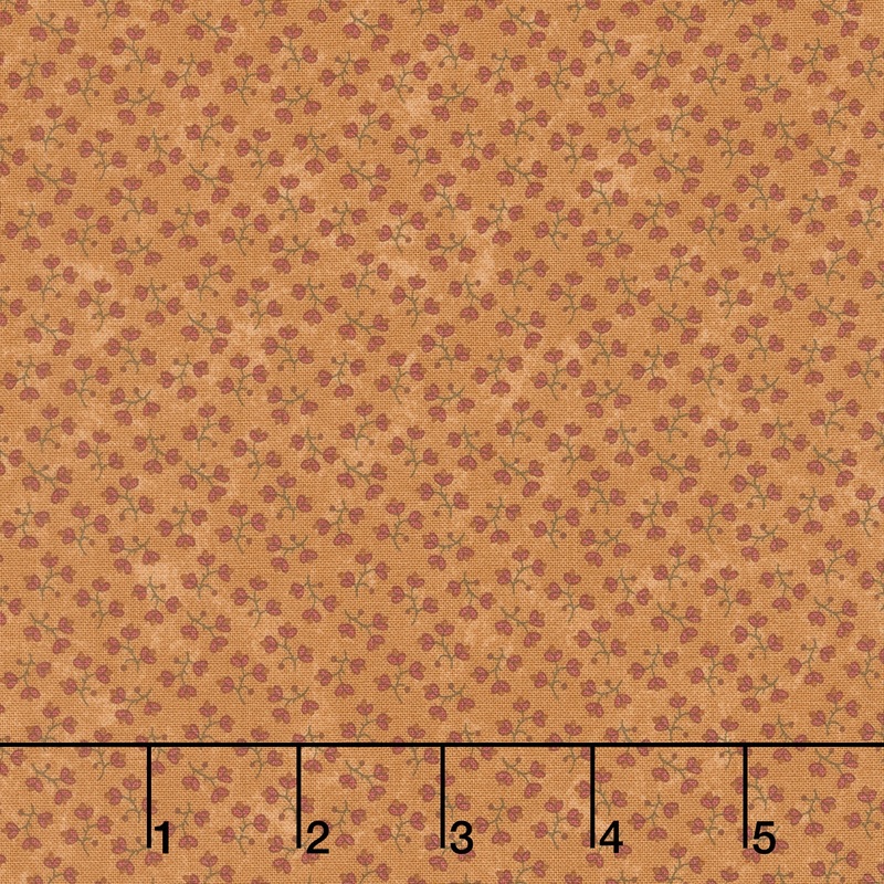 Red flower buds on a dark gold background. Give your quilt homespun appeal with the pastoral prints in Chickadee Landing. This collection by Kansas Troubles Quilters for Moda Fabric features calico, ditsy flowers, and petite dots and swirls. The simple prints in dark shades are beautifully balanced by tonal cream designs.