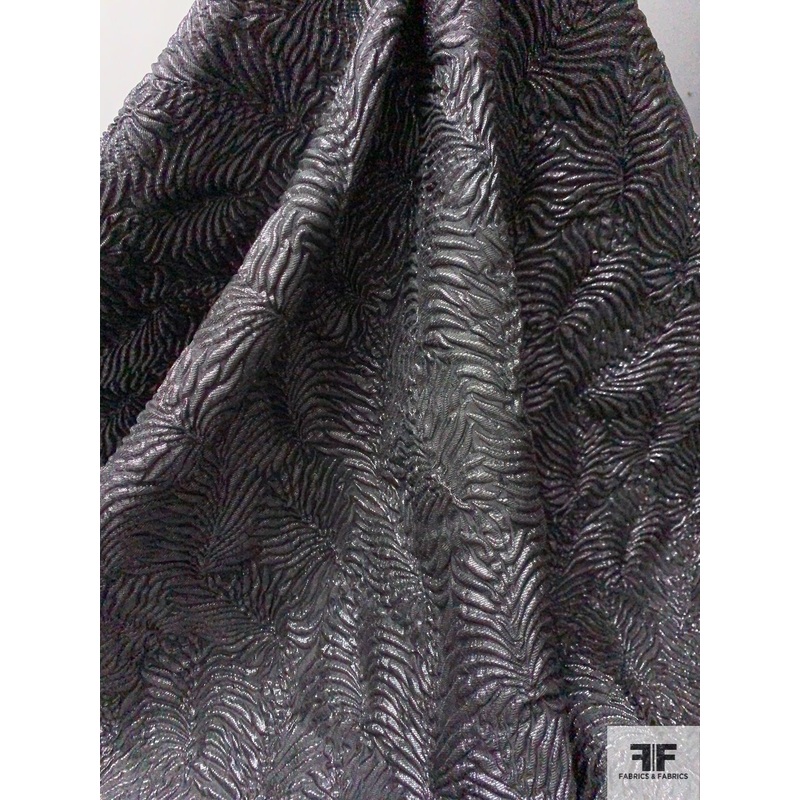Exquisitely woven in Italy for Christian Siriano, this lightweight metallic leaf cloqu gleams in a shimmery gunmetal grey. Its semiopaque ground and signature puckered texture catch the light with every movement, while a crisp, sculptural drape lends moder