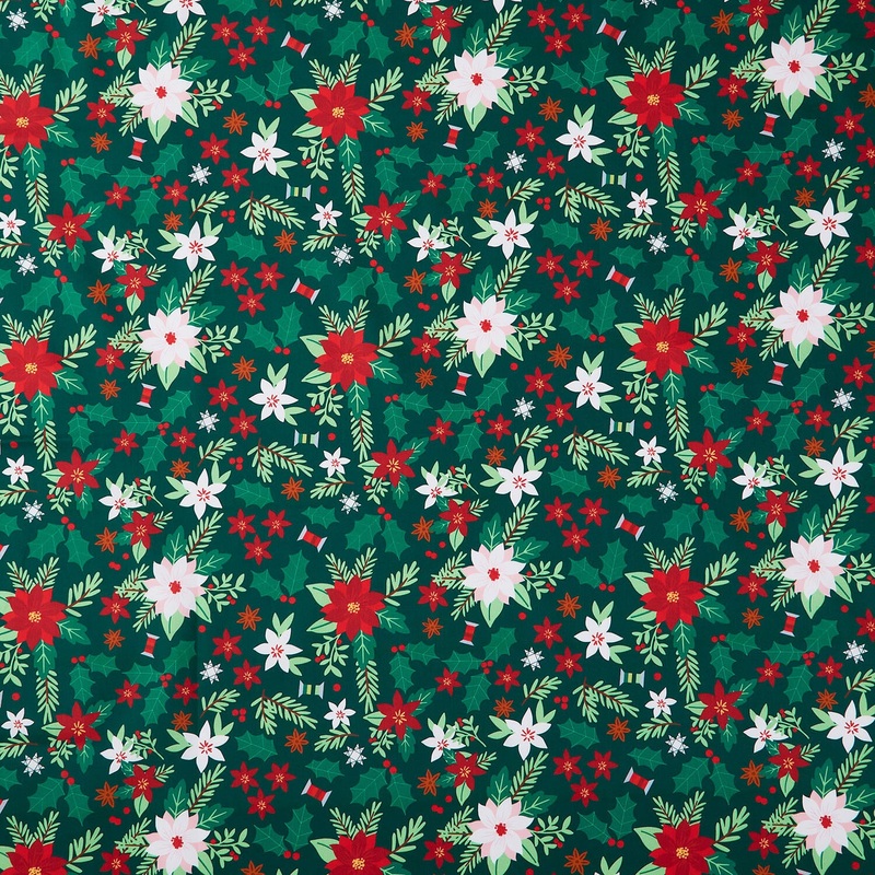 Red and white poinsettias, holly, and spools of thread on a dark green background. There's no place like Quilt Town for the holidays! With traditional Christmas motifs plus a bit of quilty fun mixed in, the Missouri Star Christmas in Quilt Town collection