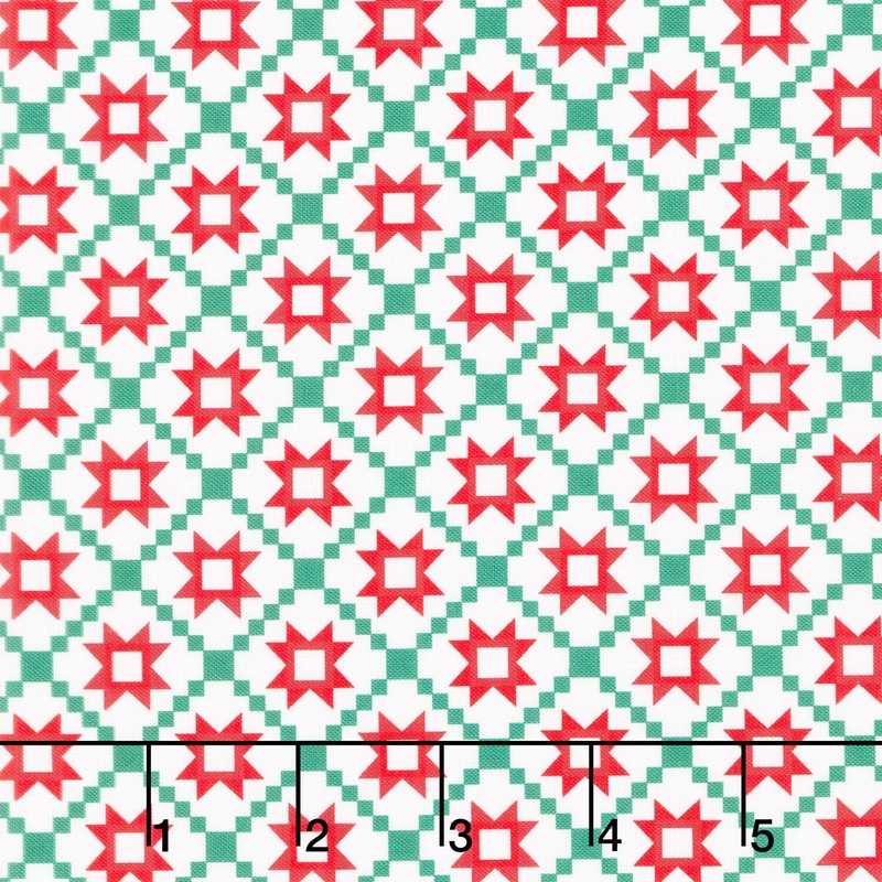 Red quilt block poinsettias in green diamonds on a white background. There's no place like Quilt Town for the holidays! With traditional Christmas motifs plus a bit of quilty fun mixed in, the Missouri Star Christmas in Quilt Town collection is perfect for