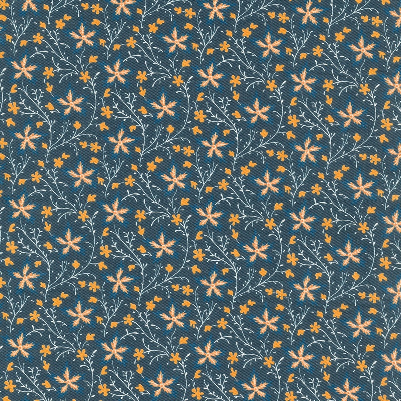 Orange flowers and white vines on an indigo background. Say Cheese! Youll be smiling ear to ear when you make a picture-perfect quilt with Circa – Sharp Cheddar. This collection by Whistler Studios for Windham Fabrics features rich, golden cheddar colors. It has an assortment of small florals and ditsy prints with cheddar as the main color and as highlights in both dark and light backgrounds. Its beautiful no matter how you slice it!