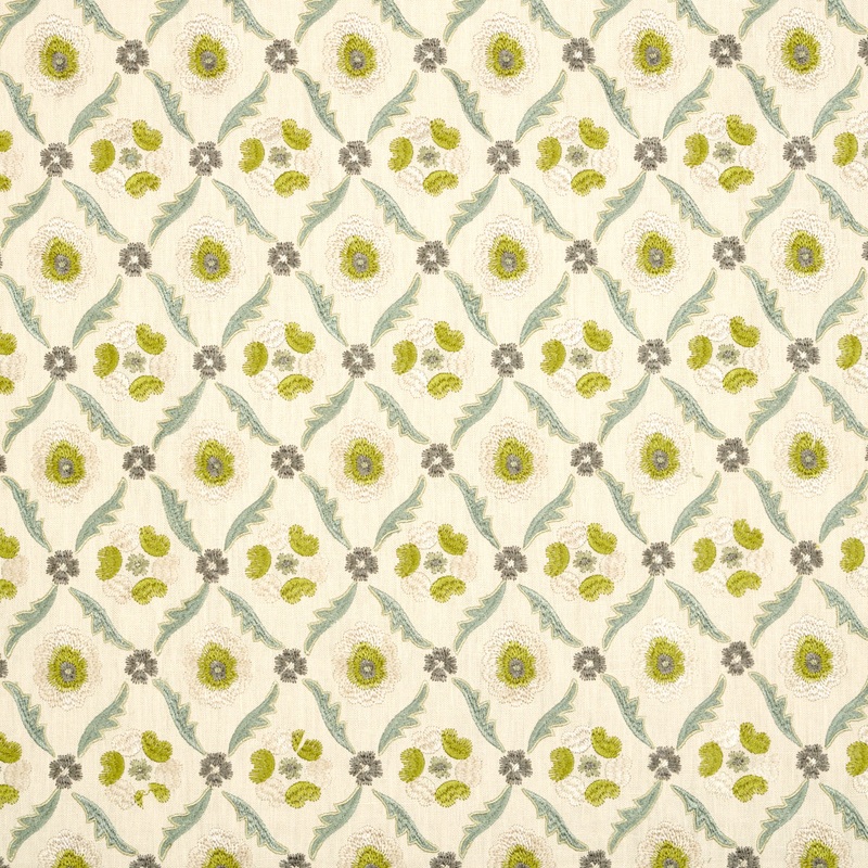 An elegant botanical trellis pattern, Claremont Embroidery features lustrous satin-stitched embroidery on a beautiful linen ground. This rich, textural design, with its wonderful flowers and decorative leaves, works beautifully for light upholstery, pillows and window treatments. Claremont Embroidery fabric in chartreuse color by Schumacher is a popular fabric in the Chroma collection. Schumacher Pattern Number 65741. Fabric World Product ID 533447.