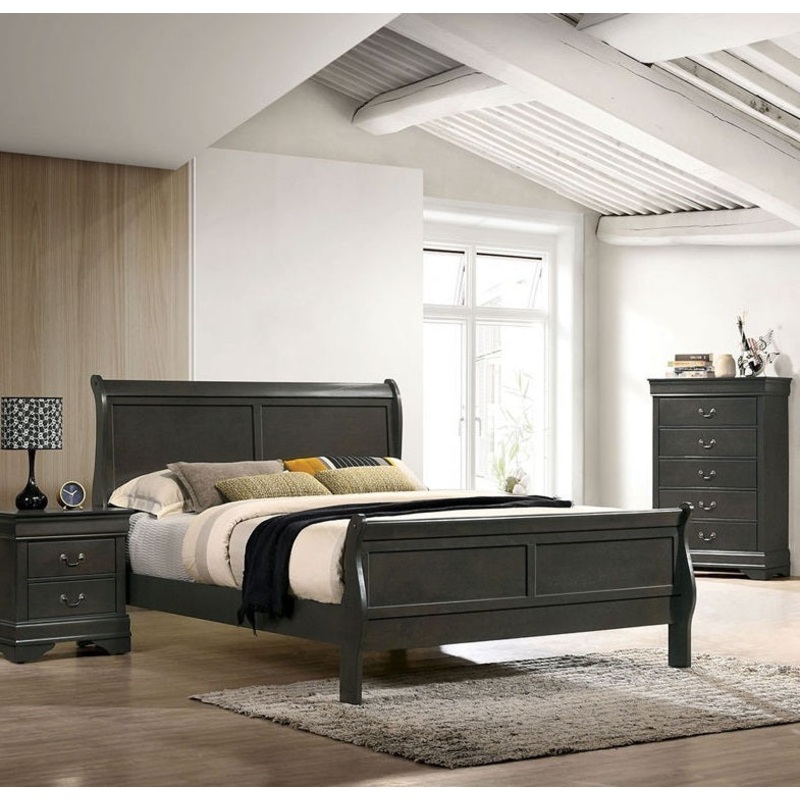 Product Description:-Style your master bedroom however you like with this classic collection, featuring a sleigh bed design with matching multi-storage case goods, all with an identical Grey finish. The night stand, chest and dresser allow you to store clothes, bedding and any other items. Bring a unique taste to your bedroom while creating a relaxing and stylish environment.Product Dimensions:-Eastern King Size Bed :- 88 3/8″L X 78 1/8″W X 47 1/4″HListing Includes :- Eastern King Size Bed Only.Dresser, Mirror Nightstand And Chest Is Not Included.Simple Assembly Requires:Shipment Service:Shipping Service include curb side delivery with free lift gate service,NOTE : No inside home delivery.Shipment will take around 8-14 Business daysFeatures:-.Transitional styleGray ColorSleigh Design BedframeBracket FeetEnglish Dovetail ConstructionFoundation RequiredSolid Wood, Wood Veneer, OthersMaster Bedroom Furniture