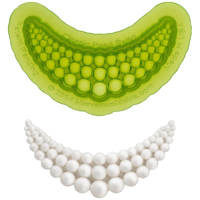 The Classic Pearl Swag quickly transforms fondant, gum paste or modeling chocolate into a triple strand of pearls graduating from larger in the center to smaller pearls at the ends. The pearl sizes also increase from the top strand to the bottom strand. Cl