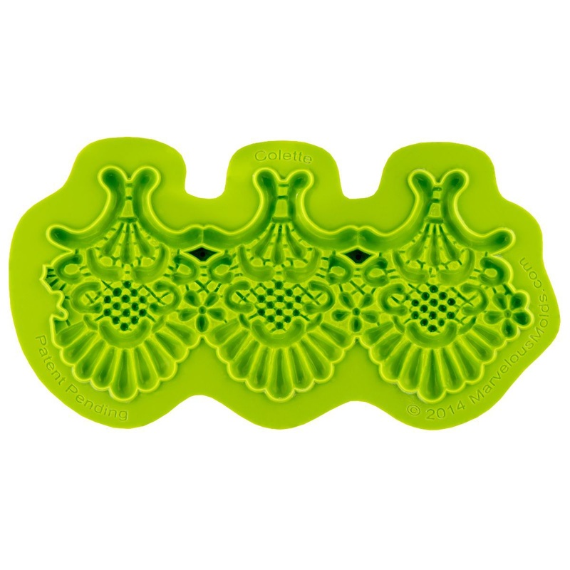 Arranged in a horizontal triplet motif, the Collette lace mold is an elegant and enhanced lace pattern with delicate details of striking lattice and floral pattern.