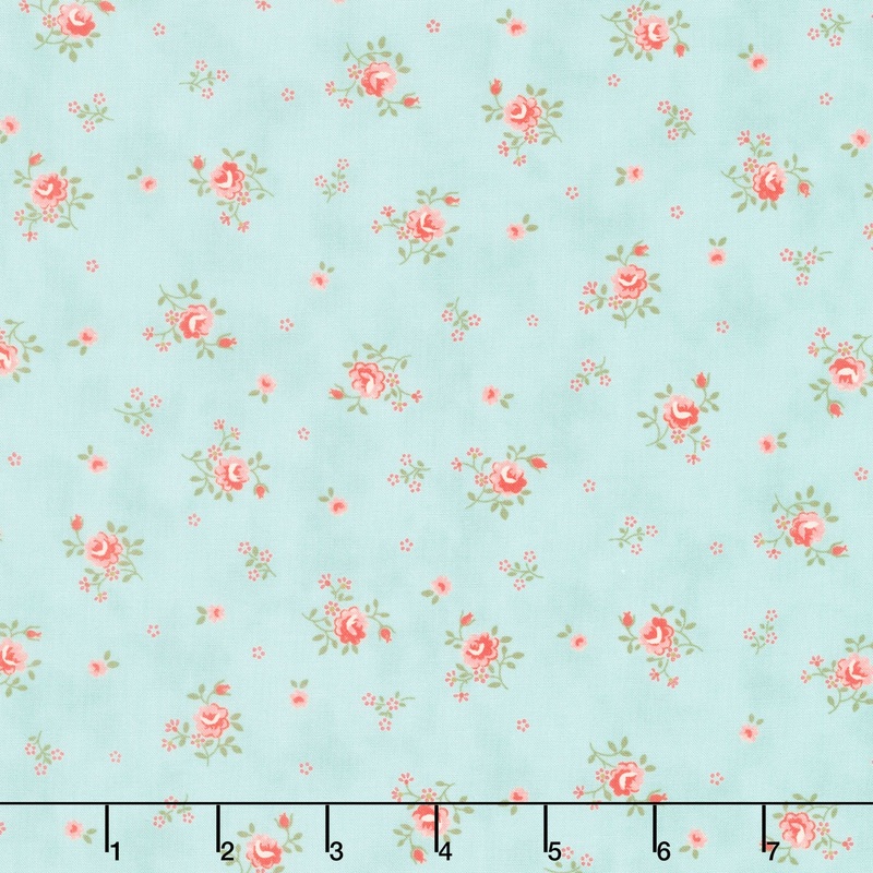 Small red posies on an aqua background. Collection for a Cause - Etchings is the newest in a series of fabrics from Moda that supports charitable causes. The Etchings collection, in a red, aqua, and slate color palette, is based on antique textiles and boo