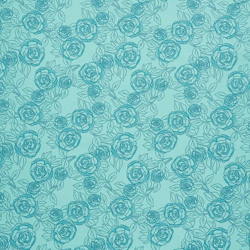 Large sketched roses in teal are clustered on a lighter teal background. Its a garden of delights! The Color Me Pretty collection by Stephanie Organes for Andover Fabrics features roses, lilacs, and vines in bold hues of pink, purple, green, orange, and go