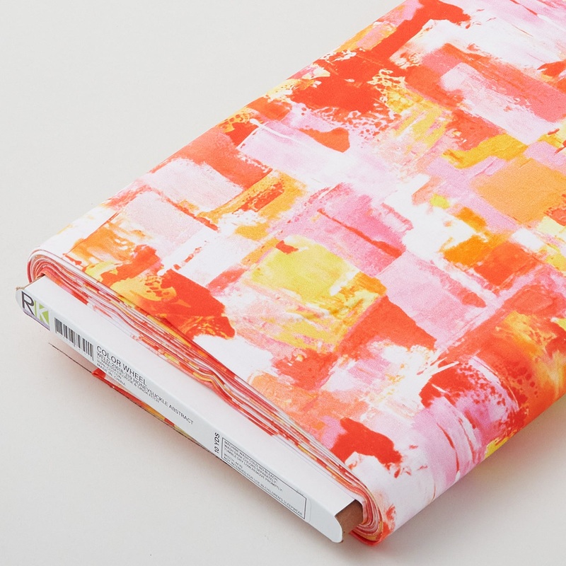 A 10-yard bolt of a yellow, pink, and white abstract geometric print on an orange background. Sew with style and color! Color Wheel by Wishwell for Robert Kaufman is a beautiful fabric collection inspired by all the colors of the rainbow. This collection features flowers, paint splatters, and fun geometric shapes. Let the colors of the rainbow inspire you!