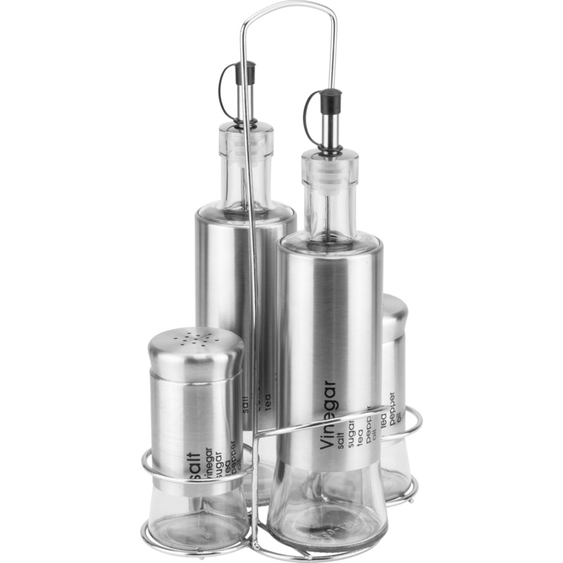 Sold in set of 4 (not for individual sale)2x bottle oil/vinegar 320ml each2x shaker salt/pepper 110ml each1x stand