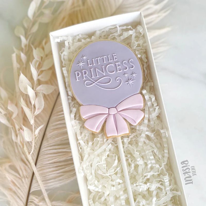 This set includes:- Cookie pop with bow cookie cutter- Cookie pop with bow fondant cutter- Bow embosserSize: 67mm wide x 91mm tallPlease note this set does not include theLittle Princess' debosser featured in the image