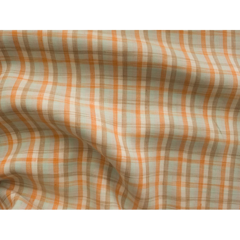 This light/medium weight linen features a yarn dyed plaid pattern that includes orange, mint green, cream, and brown threads. It has a soft hand, lovely drape and is fairly opaque. This fabric is perfect for tops, dresses, skirts, and more.