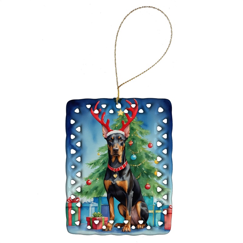 Porcelain Ornament featuring breed specific Doberman Pinscher artwork. Celebrate Christmas with this Christmas Ornament. Add a unique, personal touch to your holiday decor with our Rectangular Lattice Porcelain Ornament. Perfect for creating cherished memories, this high-quality ornament shines under festive lights, reflecting warmth and joy throughout your Christmas tree. Crafted with a glossy finish, it showcases vibrant, full-color artwork contributed by our talented artists, ensuring your tree is adorned with a burst of color and holiday spirit. What sets this Porcelain Ornament apart is its customizable white back. Use a paint pen or permanent marker to write a heartfelt message, commemorate a special year, or mark an unforgettable date, turning this ornament into a keepsake that will be treasured for years to come. For best results, allow any personalization to dry thoroughly before handling. Each ornament comes complete with a delicate gold cord, making it easy to hang and display. Proudly made in the USA, this ornament measures 3.375 x 2.625 inches and is a thoughtful gift for pet sitters, teachers, family members, or anyone who would appreciate a little extra holiday magic. Bring style, charm, and a touch of personal meaning to your Christmas tree with this beautifully designed ornament..